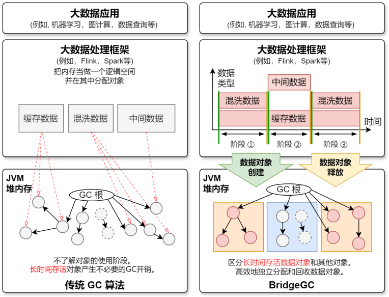 当前Apache Flink、Spark等主流大数据框架普遍运行于JVM平台,其内存管理依赖JVM虚拟机的GC算法。然而,大数据应用通常会产生大量长生命周期的数据对象,这与传统GC算法针对短生命周期对象优化的设计假设存在显著差异,导致GC效率低下,影响系统性能。